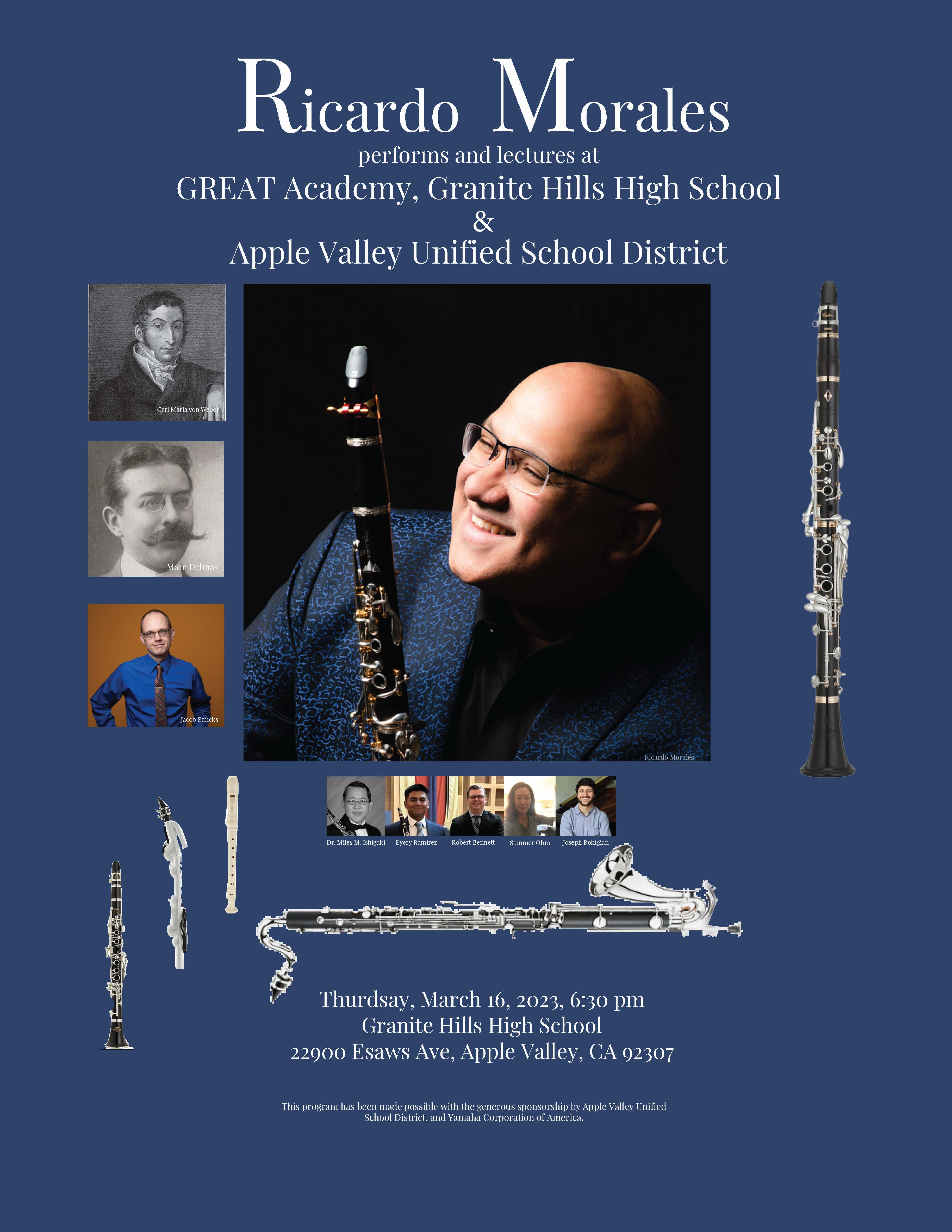 APPLE VALLEY, CA – The GREAT Academy, an AME/CTE Model Technical Demonstration site for the California Department of Education, is thrilled to welcome Ricardo Morales. Morales will be visiting the school on March 16th and 17th. One of the most sought-after clarinetists in the world, Morales has performed at Carnegie Hall in New York, the Royal Albert Hall in London, the Philharmonie de Paris, and the Art Tower Mito in Japan, in the past year! Morales will be working with elementary and high school students during his visit, giving masterclasses and coaching sessions.